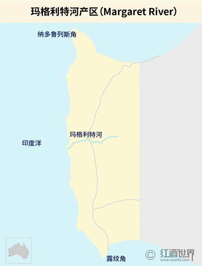 瑪格利特河產區位于澳大利亞西澳州(Western Australia)的西南角,距該州首府珀斯(Perth)約270公里,是世界上地理位置最偏僻的葡萄酒產區之一。