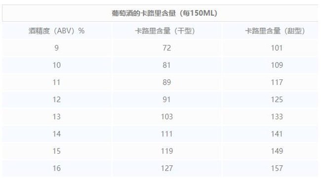 葡萄酒的熱量與其所含的酒精度息息相關(參考下表),因此不能簡單地用白葡萄酒、紅葡萄酒來做比較。