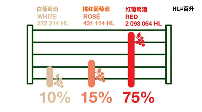 2019年,在羅納河谷葡萄酒約2.8億升的總產量中,紅葡萄酒貢獻了近2.09億升,占總產量的75%;桃紅葡萄酒的產量約為0.43億升,占總產量的15%;白葡萄酒的產量約為0.27億升,占總產量的10%。