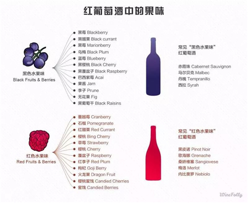 ①紅葡萄酒中的果味有兩類(lèi),紅色水果和黑色水果,這是盲品中判斷葡萄酒風(fēng)格的一大依據(jù);