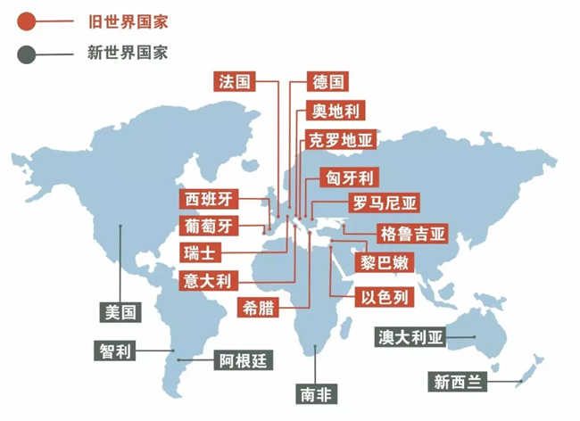 在逛展會(huì)的時(shí)候我們經(jīng)常會(huì)聽到說,這個(gè)是來自新世界國家的葡萄酒,那個(gè)是來自舊世界國家的葡萄酒,有的可能會(huì)問新世界的葡萄酒怎樣怎樣,舊世界的葡萄酒怎樣怎樣。那么,新舊世界的葡萄酒到底有什么不一樣的呢?