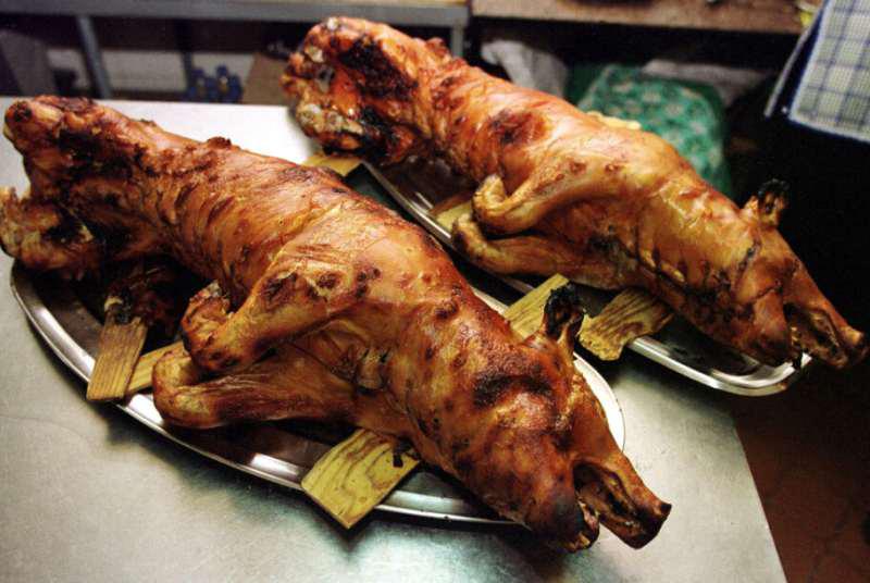 迥別于中式烤乳豬的葡式烤乳豬,先用橄欖油、葡萄酒、黑胡椒、百里香、大蒜等食材制作的調味汁進行腌漬,烘烤的過程中在表皮涂以橄欖油,肉質柔嫩不干,皮香肉嫩。它可以與巴巴萊斯科干紅葡萄酒(Barbaresco)、黑皮諾干紅葡萄酒(Pinot Noir)、梅洛干紅葡萄酒和維歐尼干白葡萄酒(Viognier)等搭配享用。