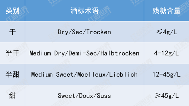 根據酒液中的殘糖量,人們將靜止葡萄酒分成了四個類別:干型(Dry)、半干型(Medium)、半甜型(Medium Sweet)和甜型(Sweet)。