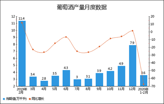 2020年1-2月全國葡萄酒產量分月數據