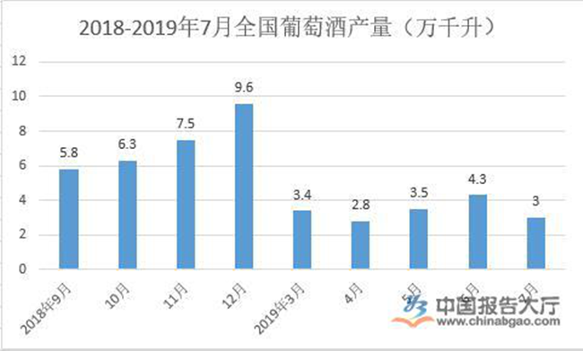 葡萄酒行業(yè)分析表示,根據(jù)國家統(tǒng)計局最新數(shù)據(jù)顯示,2018年全年全國葡萄酒產(chǎn)量達到了62.9萬千升,累計下降7.4%。截止至2019年6月全國葡萄酒產(chǎn)量為4.3萬千升,同比下降6.5%。累計方面,2019年1-6月全國葡萄酒產(chǎn)量達到24.5萬千升,累計下降19.9%。