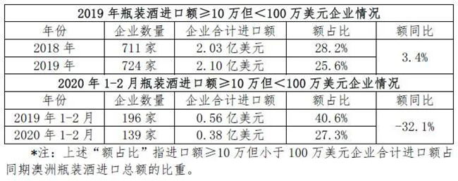 今年1-2月,盡管疫情對行業有一定沖擊,但澳洲瓶裝酒進口頭部企業基本穩住陣腳。雖然進口額≥1000萬美元的企業僅1家,少于去年同期,但其進口額同比增長近30%;而進口額≥500萬但小于1000萬美元的企業有2家,數量增加,其中,1家進口額實現倍數增長,1家為新的行業進入者。