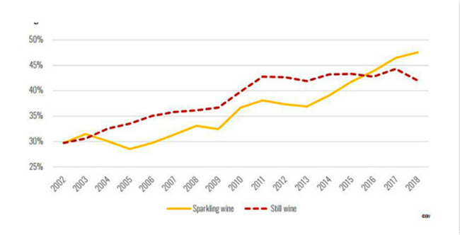 在過去,起泡葡萄酒的國際貿(mào)易少于靜止葡萄酒。但從2016年開始,這一趨勢發(fā)生了逆轉(zhuǎn)。2018年,起泡葡萄酒所占貿(mào)易份額為48%,而靜止酒為43%。