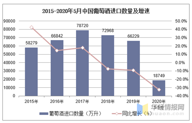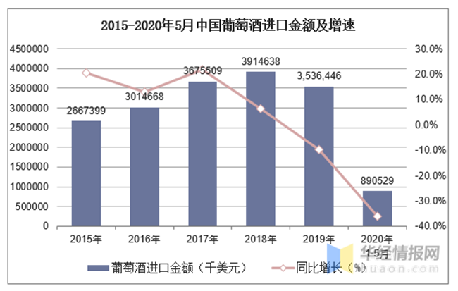 華經產業研究院數據顯示:2020年1-5月中國葡萄酒進口數量為18749萬升,相比上年同期減少了8910.5萬升,降幅為32.2%;進口金額為890529千美元,相比上年同期減少了497981千美元,降幅為35.9%;2020年1-5月中國葡萄酒進口均價為47.50千美元/萬升。