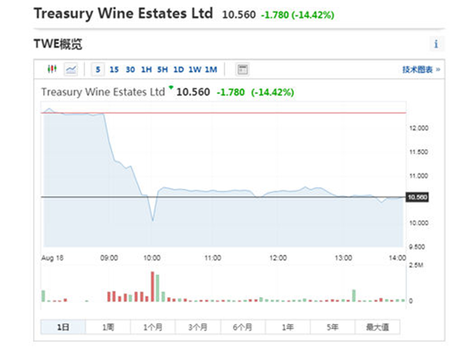 澳大利亞葡萄酒巨頭富邑葡萄酒集團(Treasury Wine Estates)發(fā)表聲明稱,將配合中國相關部門新宣布的對澳大利亞向中國出口葡萄酒的反傾銷調查。但僅在該聲明發(fā)表后不久,該企業(yè)股價便迎來斷崖式下跌,盤中股價一度跌至10.050澳幣,截止收盤,報10.560澳幣,下跌14.42%。