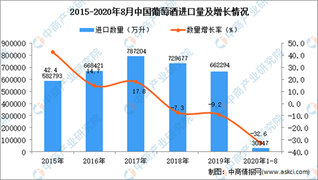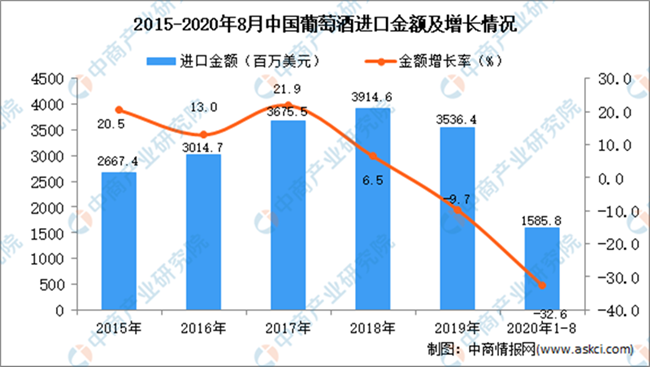 2020年1-8月中國(guó)葡萄酒進(jìn)口量及金額增長(zhǎng)情況