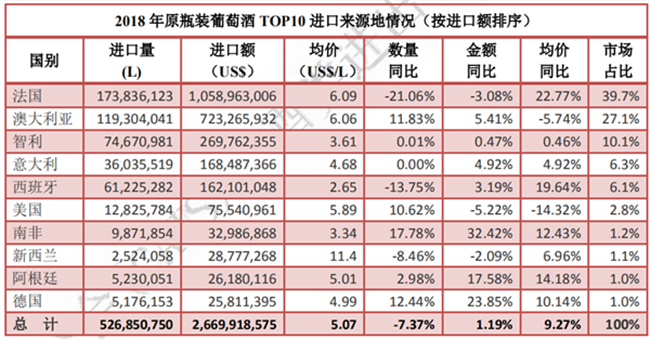 2018 年,葡萄酒進(jìn)口量雖出現(xiàn)了自 2014 年來(lái)的首次下行數(shù)據(jù),但跌幅較小,且進(jìn)口額依然實(shí)現(xiàn)了微幅增長(zhǎng),達(dá)到 28.6 億美元,約占酒類(lèi)進(jìn)口總額的 49.5%,位列進(jìn)口酒類(lèi)第一位。其中: