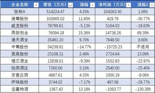 2018年被認為是中國葡萄酒行業的調整之年,整個葡萄酒行業呈現出小幅下滑的局面,據國家統計局數據,2018年全國規模以上葡萄酒企業總產量62.9萬千升,比2017年下降7.36%;累計實現銷售收入288.51億元,同比下降9.51%;累計實現利潤總額30.63億元,同比下降9.46%。這12家上市企業發布的年報數據,與去年整年的行業氛圍相符。大概也正是因為去年行業“看跌”的聲音不絕于耳,提前打了“預防針”,當全年數據公布和12家公司年報披露時,行業沒有表現出很大的落差。