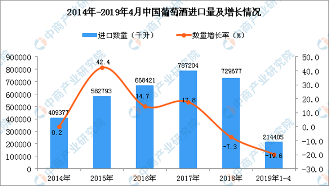 • 2019年1-4月中國葡萄酒進口量同比下降19.6%