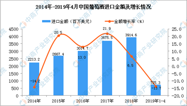 從金額方面來看,2013年-2014年中國葡萄酒進口金額有小幅度下降,2015年-2018年中國葡萄酒進口金額增長;2019年1-4月中國葡萄酒進口金額為725.3百萬美元,同比下降13.7%。