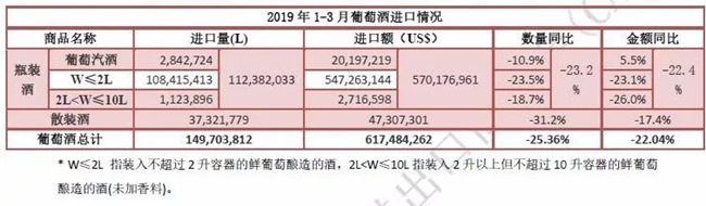 近日,中國(guó)食品土畜進(jìn)出口商會(huì)酒類進(jìn)出口商分會(huì)發(fā)布2019年一季度酒類進(jìn)口統(tǒng)計(jì)報(bào)告。報(bào)告顯示,一季度,進(jìn)口酒類市場(chǎng)整體呈下行態(tài)勢(shì),且降幅仍在擴(kuò)大。其中,葡萄酒進(jìn)口延續(xù)跌勢(shì),量額跌幅均逾兩成。進(jìn)口量1.5億升,進(jìn)口額6.2億美元,約占酒類進(jìn)口總額的55.4%。