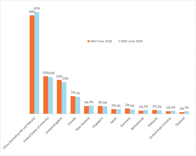 澳大利亞葡萄酒在中國表現(xiàn)非常良好。回顧2019年的前5個月,澳大利亞在進口額上成為中國大陸排名第一的葡萄酒進口來源國。同時,在全球葡萄酒進口市場總量下挫22%的情況下,澳大利亞葡萄酒在中國大陸的表現(xiàn)依然強勢,其市場份額相比于2015年增長了13%,達到了進口總量的24%。澳大利亞鞏固了其作為中國市場優(yōu)質(zhì)葡萄酒主要供應(yīng)商的顯赫地位。