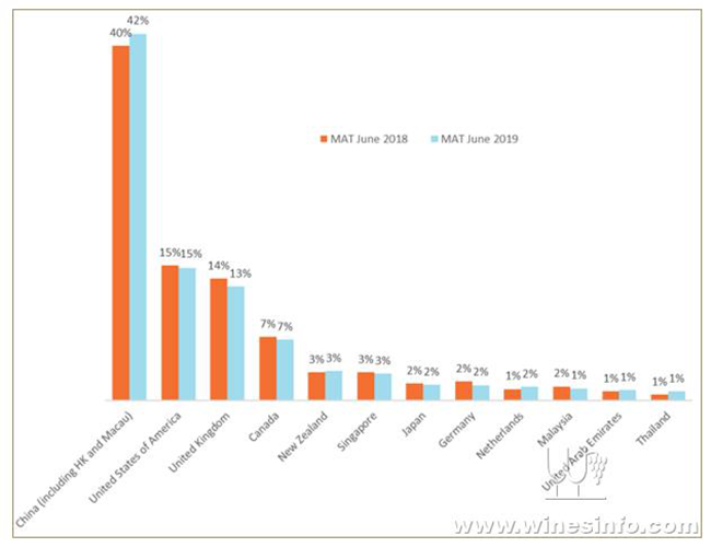 澳大利亞葡萄酒管理局(Wine Australia)近期發(fā)布了截至2019年6月的12個(gè)月的出口報(bào)告,報(bào)告顯示2018-2019財(cái)年澳洲對中國(包括香港和澳門)的葡萄酒出口創(chuàng)下了最新記錄,出口值增長了7%,達(dá)到12億澳元。