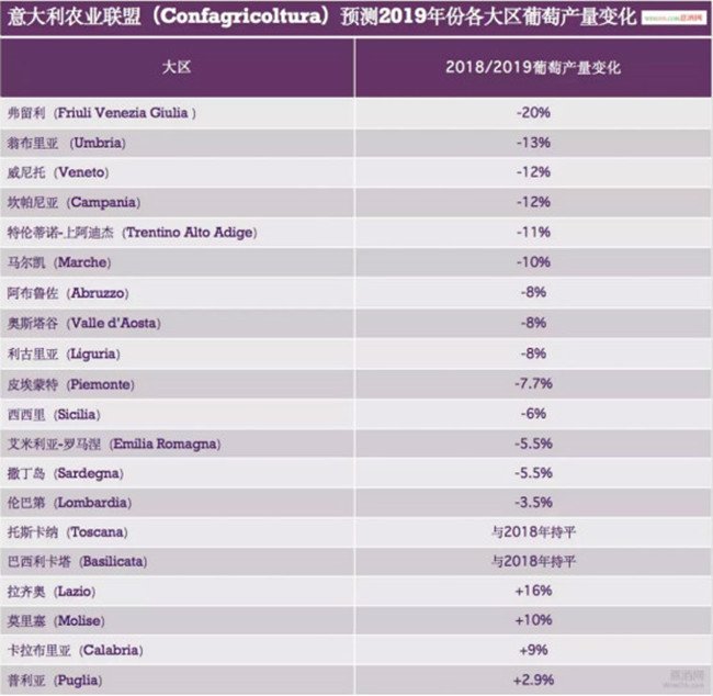 意大利農(nóng)業(yè)聯(lián)盟(Confagricoltura)研究中心也主要針對2019年意大利各大區(qū)的葡萄產(chǎn)量進(jìn)行了預(yù)測。在分析了來自個(gè)大區(qū)主要葡萄酒產(chǎn)區(qū)的代表性酒莊的葡萄樣本之后,意大利農(nóng)業(yè)聯(lián)盟(Confagricoltura)研究中心認(rèn)為,2019年,意大利大部分地區(qū)的葡萄產(chǎn)量都將出現(xiàn)不同程度的下降。其中弗留利(Friuli Venezia Giulia )大區(qū)的葡萄產(chǎn)量降幅最大,預(yù)計(jì)將比2018年減少20%。翁布里亞、威尼托、坎帕尼亞、特倫蒂諾-上阿迪杰、皮埃蒙特、艾米莉亞-羅馬涅等大區(qū)在2019年的葡萄產(chǎn)量都將出現(xiàn)不同程度的降幅。