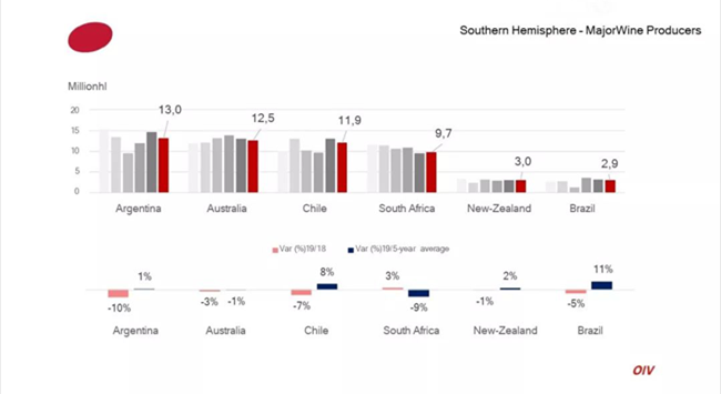 南半球葡萄酒產國中,阿根廷產量跌幅最重,下降10%,南非則逆勢增長3%。