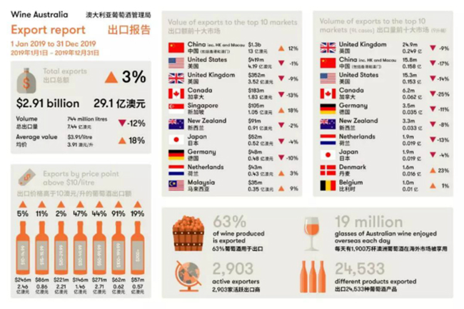 隨著市場對精品澳大利亞葡萄酒的需求日益增長,截至2019年12月底的12個月中,澳大利亞葡萄酒的出口總額增長了3%至29.1億澳元。