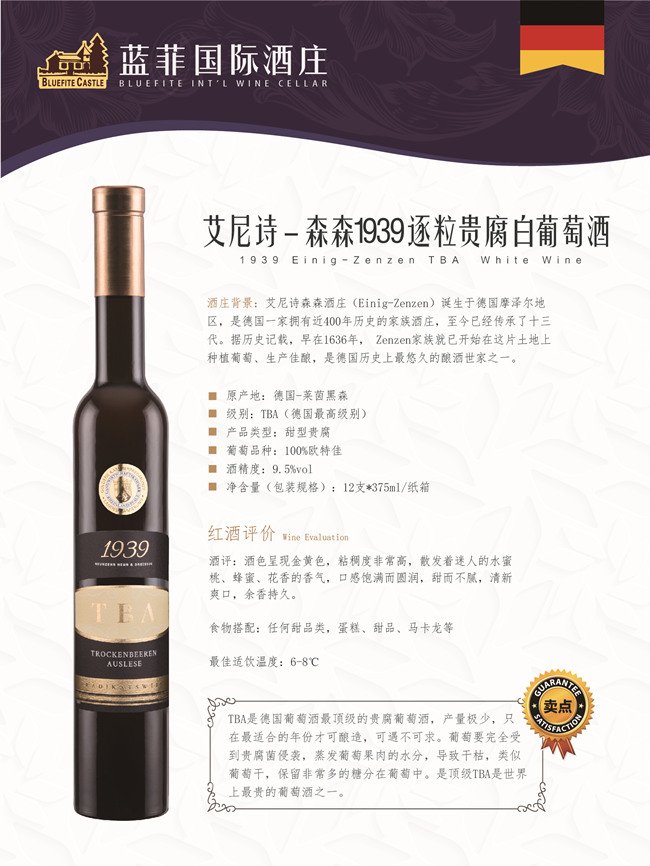 艾尼詩-森森1939逐粒貴腐白葡萄酒呈現金黃色,粘稠度非常高;散發著迷人的水蜜桃、蜂蜜、花香的香氣;口感飽滿而圓潤,甜而不膩,清新爽口,余香持久,可搭配任何甜品類,蛋糕、布丁、馬卡龍等,最是適合閨蜜的下午茶聚會,極具品味與格調!