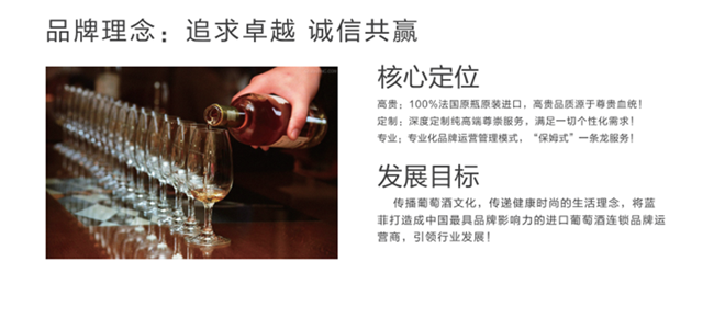藍菲用十二年的經驗,打造了獨一無二的品牌體系和運營體系,在十二年的時間里一直秉持“追求卓越、誠信共贏” 的經營理念和服務宗旨,以客戶為中心、以市場為導向,致力于打造中國最有品牌影響力的進口紅酒連鎖品牌。